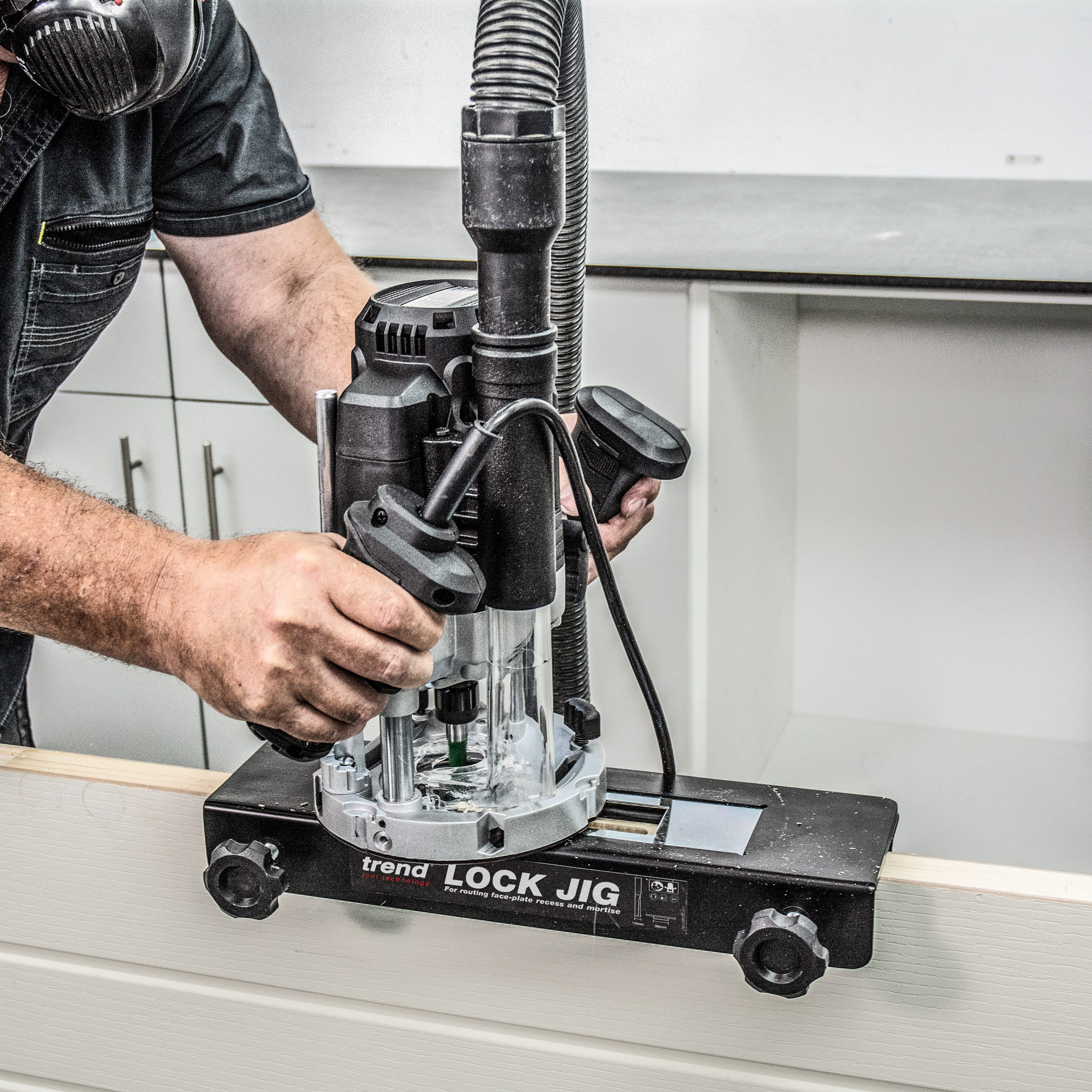 Requires a router (½”/12mm collet with 80mm plunge), cutter (½”/12mm shank x 12mm cut diameter x 63mm cut length) and guide bush (30mm diameter x 6mm spigot).